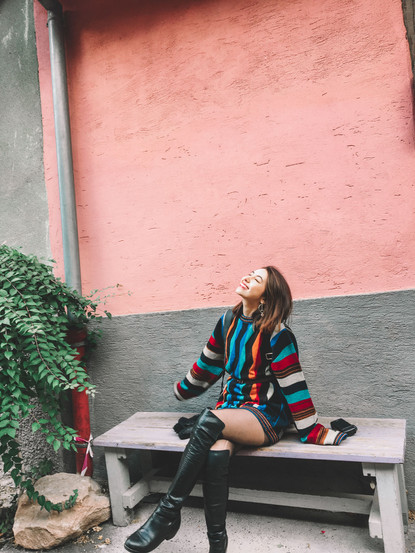 To channel my inner Belle, I donned a sweet and playful outfit that perfectly complemented the fairytale-like backdrop. My vibrant woolen jumper from a secondhand store in Lyon, France, coordinated perfectly with the pastel colored houses. Thigh-high boots are a great way for short girls (like me) to add some height and style to their look, so I opted for these leather boots that are my hero piece in the autumn/winter days. No outfit is complete without a fun and whimsical accessory, so I topped the look off by throwing on my bear ears beanie. Not only did it keep me warm, but it also gave me the feeling of being a kid again, as I wandered with amazement and excitement through these enchanting villages.