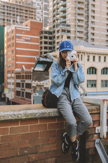 For todays look, I am in my home city, Sydney Australia! Whilst many people know Sydney for its lovely beaches and coastal walks, I thought I'd take you all into the city side, where I personally spend most of my time. This outfit is perfect for exploring the city because it's comfortable, stylish, and versatile. I opted for my signature denim-on-denim look with the jacket and hat, which not only gives "cool girl" vibes, must also keeps me nice and snug on this windy autumn day. I paired this with a classic black turtleneck to add a touch of sophistication, and for elevated comfort, opted for my grey trackies. As someone who enjoys walking around all day, sneakers were my choice of shoes. The pop of grey and black echoes the colours of my turtleneck and pants. And to top it off, I chose my watermelon socks as a playful way to break up the monotony of my outfit.